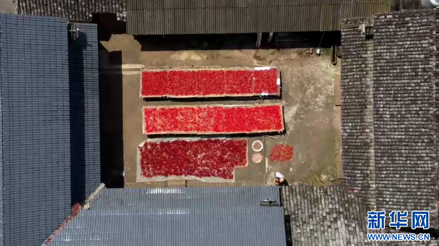 航拍鏡頭下農戶院子里曬辣椒(視頻截圖)。新華網發(施甸縣融媒體中心 供圖)