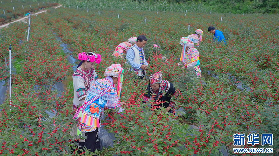 九月,在位于云南省楚雄彝族自治州武定縣貓街鎮三家村的武定縣尚農紅果種植基地里,北美冬青隨風搖曳,晶瑩剔透。