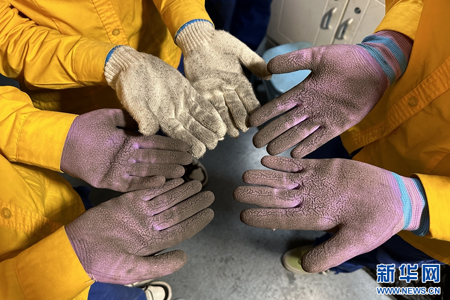 完成檢修作業,3名女接觸網工的手套沾滿了灰塵和油污。(攝于10月1日)新華網發(張家銘 攝)