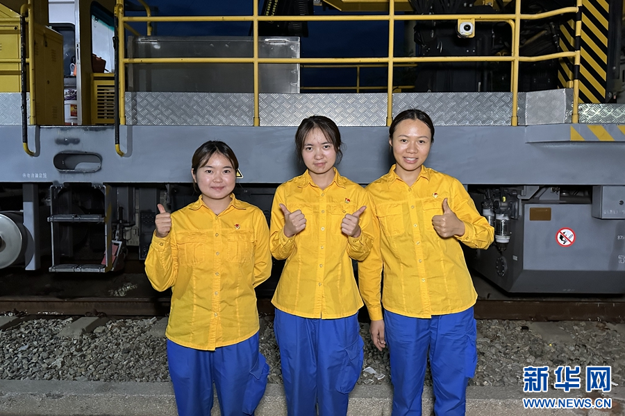 完成檢修作業,3名女接觸網工為自己和搭檔點贊。(攝于10月1日)新華網發(張家銘 攝)