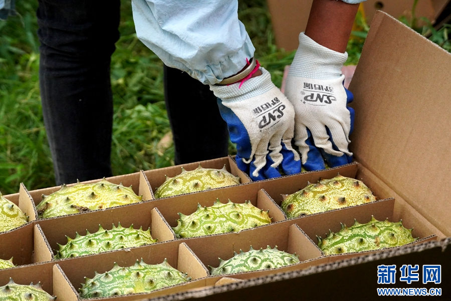農戶將火參果裝箱(10月3日攝)。新華網發(隴川縣融媒體中心供圖)