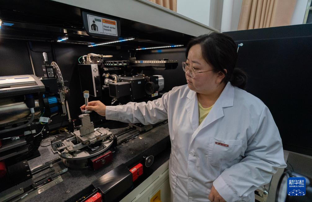 10月11日,工作人員將一塊古生物化石放入CT掃描儀內。新華社記者 陳欣波 攝