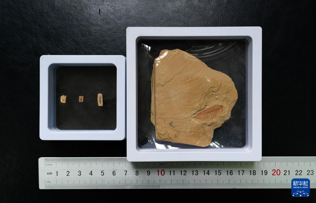 這是10月11日在云南大學古生物研究院實驗室里拍攝的名為迷人林喬利蟲的化石,從左到右為不同生長時期的迷人林喬利蟲。新華社記者陳欣波 攝