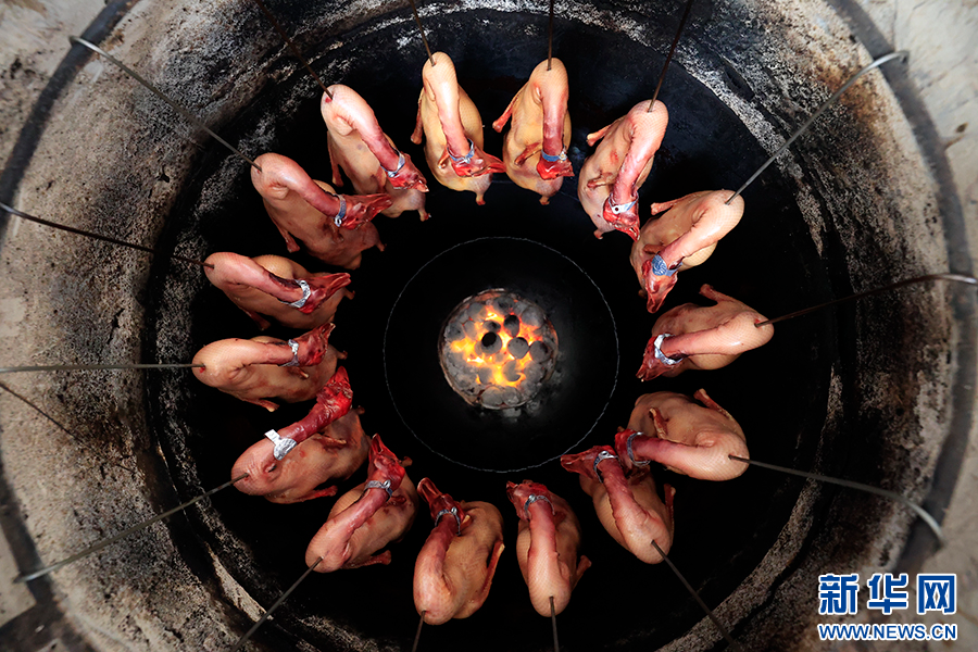 蘭紅江把鴨子放入烤爐(攝于5月17日)。新華網 趙普凡 攝