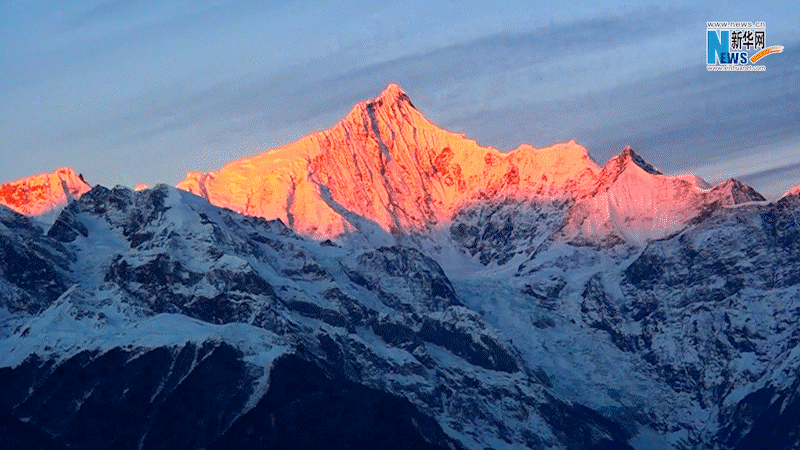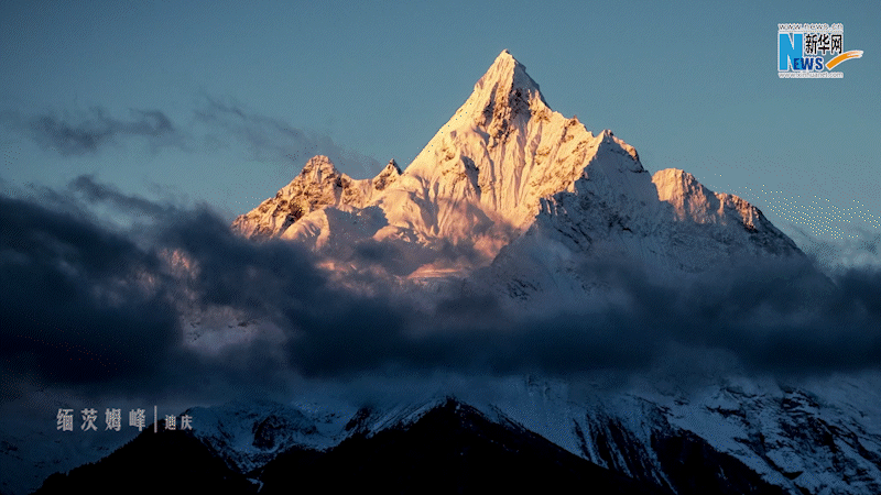 日出時,玉龍雪山被逐漸點亮,身披金光