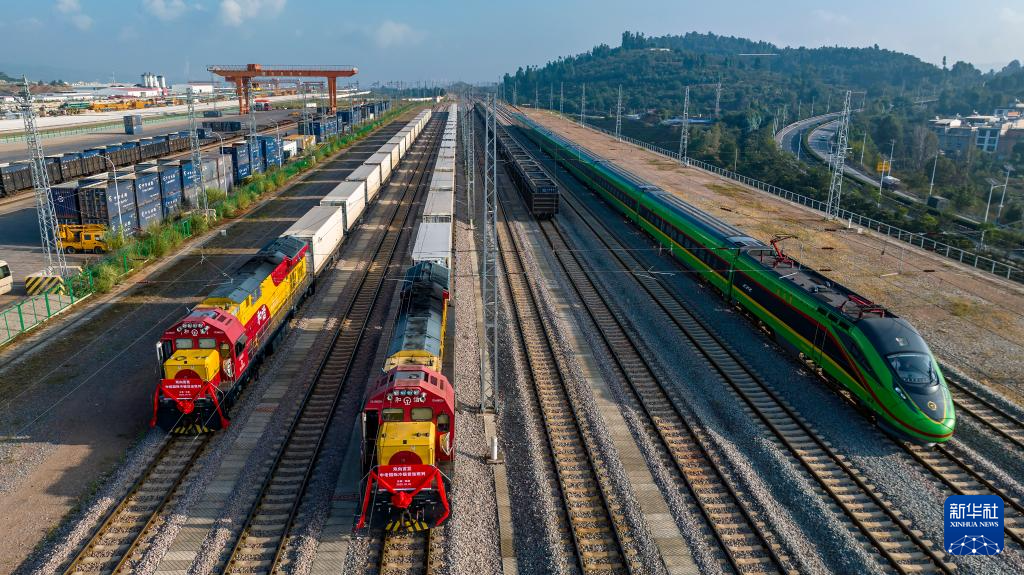 10月16日,在云南省玉溪市研和站,D887次復興號中老鐵路國際旅客列車(右)從中老、中越國際冷鏈貨運班列旁駛過(無人機照片)。