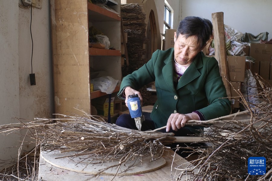 10月13日,在安徽紅方工藝品有限公司的廠房內,一名工人在使用茶樹枝原料加工擺件產品。新華社記者 欒若卉 攝