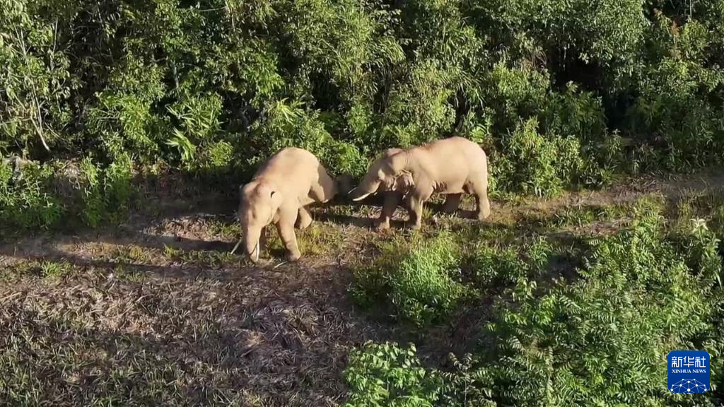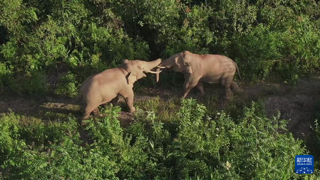 秋日里,在云南省寧洱縣勐先鎮雅鹿村,野象監測員利用無人機拍攝到兩頭成年亞洲象游蕩、覓食、玩耍的互動情景。它們會親昵地把頭靠在一起玩弄鼻子,也會用鼻子卷起食物給對方吃。暖陽下,象“哥倆”還在機耕路上相互對著頭角力,打鬧玩耍起來。讓人驚訝的是,兩頭象還玩起了“倒走游戲”,其中一頭還會甩著尾巴,用后腳有節奏地往后蹬另一頭象的鼻子,場面十分有趣。