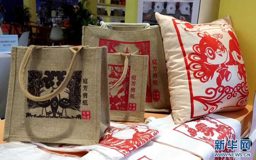 以傣族剪紙為主要元素制作的抱枕和購物袋(10月20日攝)。新華網 念新洪 攝