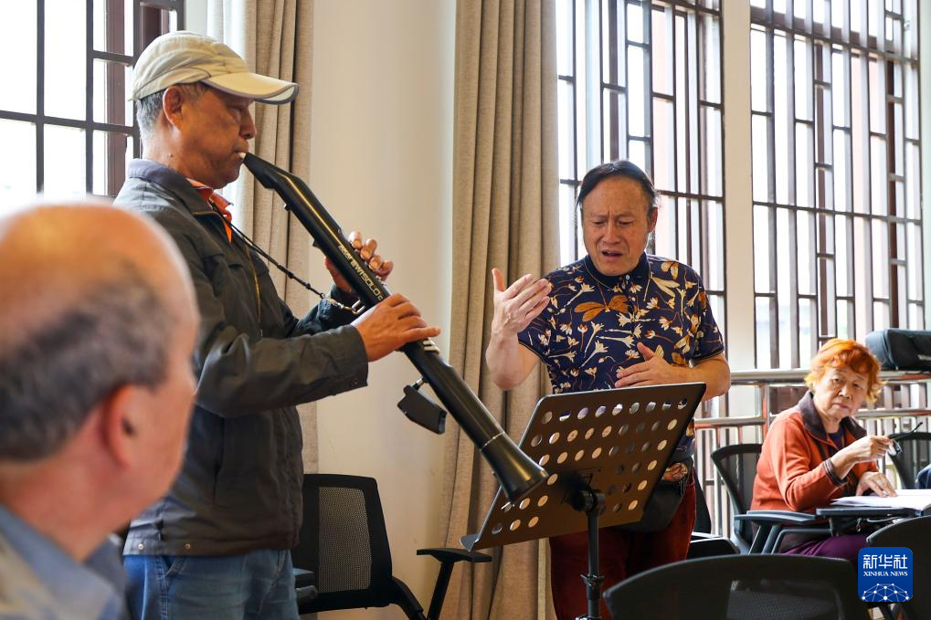 這是在云南老年大學的電吹管課上,老師(右二)在為學生授課。 新華社記者 崔文 攝
