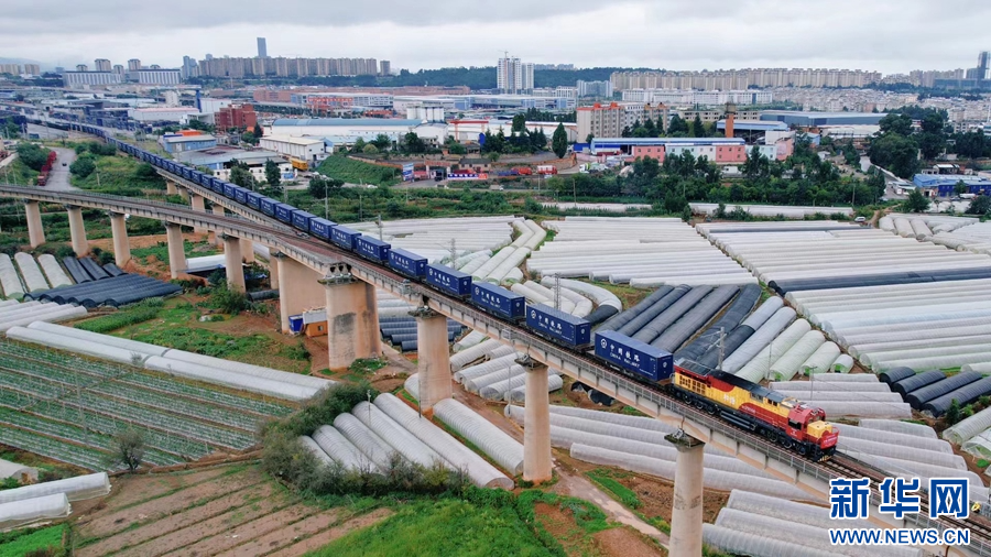 10月8日,“滬滇·瀾湄線”國際貨運班列從昆明市王家營西站駛出。新華網 趙普凡 攝