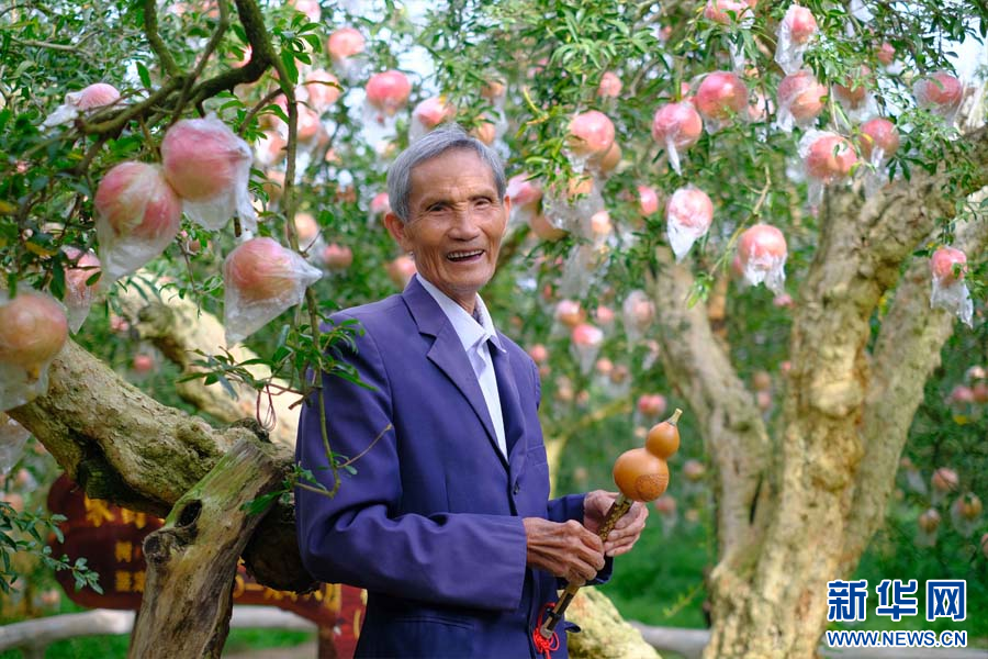 85歲的老種植戶在古樹石榴前留影(10月26日攝)。新華網發(張玨 攝)