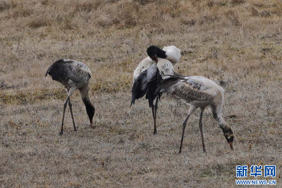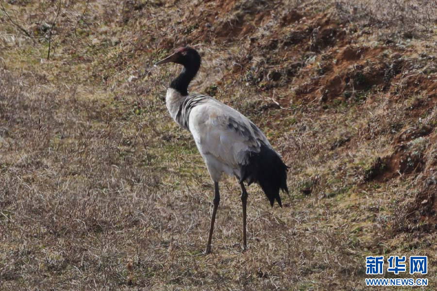 飛抵云南尋甸黑頸鶴省級自然保護區越冬的黑頸鶴(11月7日攝)。新華網發(云南尋甸黑頸鶴省級自然保護區管護局 供圖)