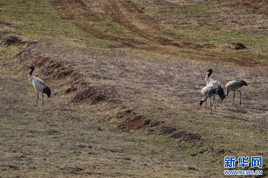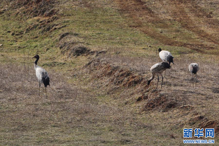 首批飛抵自然保護區的四只黑頸鶴(11月7日攝)。新華網發(云南尋甸黑頸鶴省級自然保護區管護局 供圖)