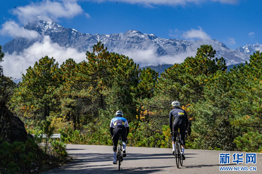 參賽選手在比賽中向著玉龍雪山方向沖刺(11月10日攝)。新華網發(2023七彩云南格蘭芬多自行車節主辦方 供圖)