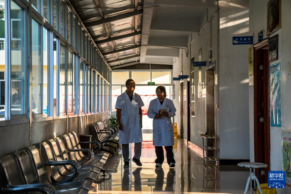 在畹町仁慈醫院,沈坤(左)在查房時查看病人病情(10月29日攝)。新華社記者 胡超 攝