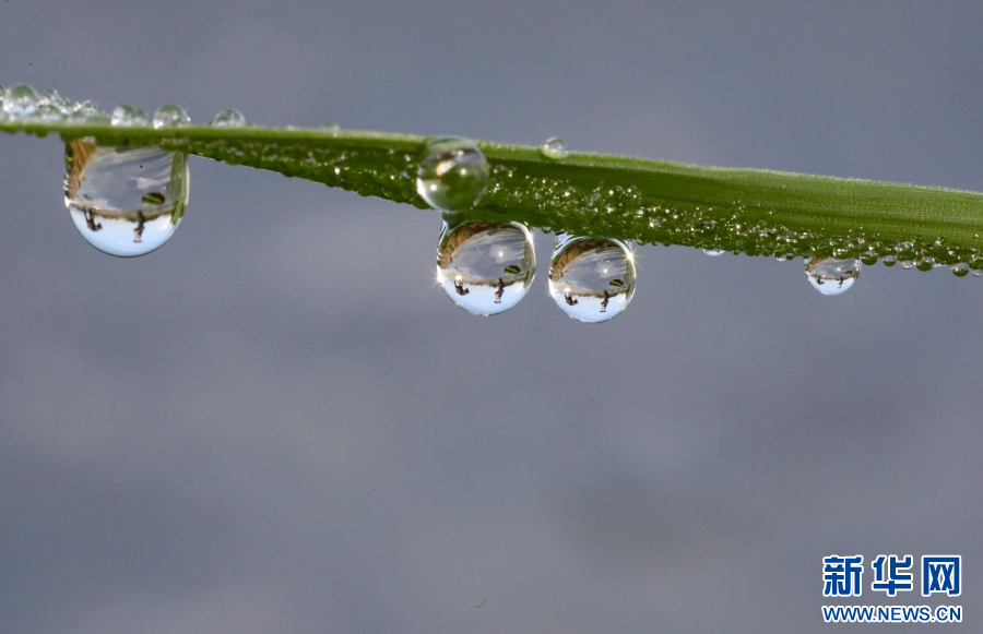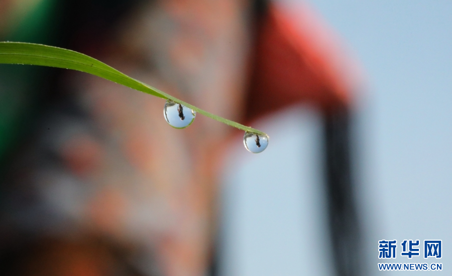 11月12日,在云南省景洪市曼弄楓街道的田間,露珠中倒映著農民忙碌的身影。