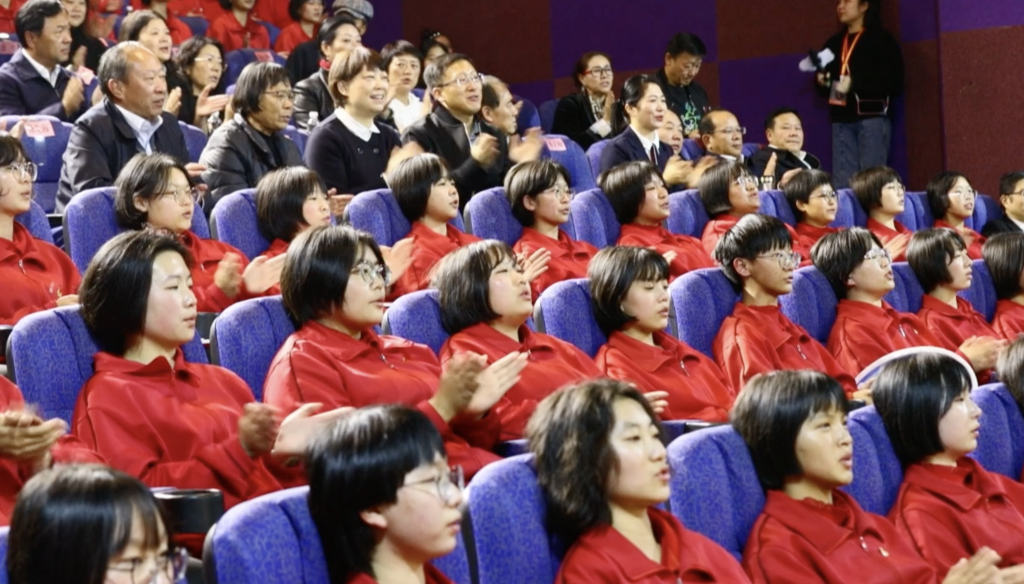 在電影點映結束后的互動環節,女高學生們發表了觀后感,并向張桂梅表達感謝。張桂梅現場帶領全體學生朗誦麗江華坪女高誓詞,一起深情歌唱《紅梅贊》。