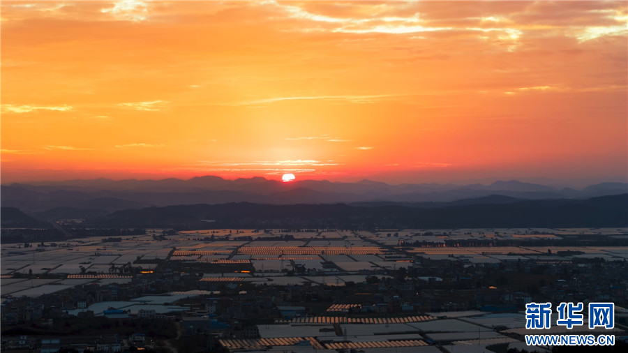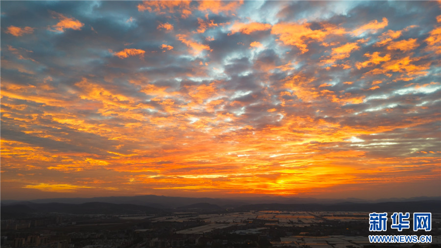 近日,云南省昆明市尋甸回族彝族自治縣出現火燒云景觀,絢爛多彩、變幻莫測的朝霞與地面蔬菜大棚相映成趣,美不勝收。(尋甸縣文旅局)