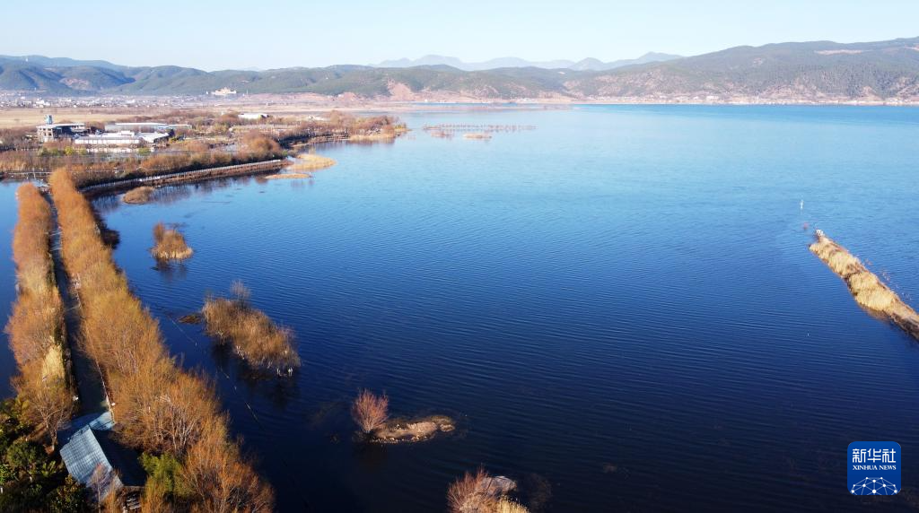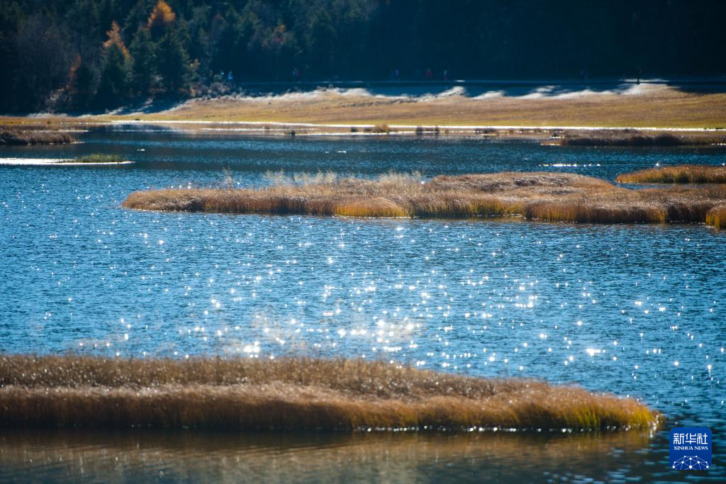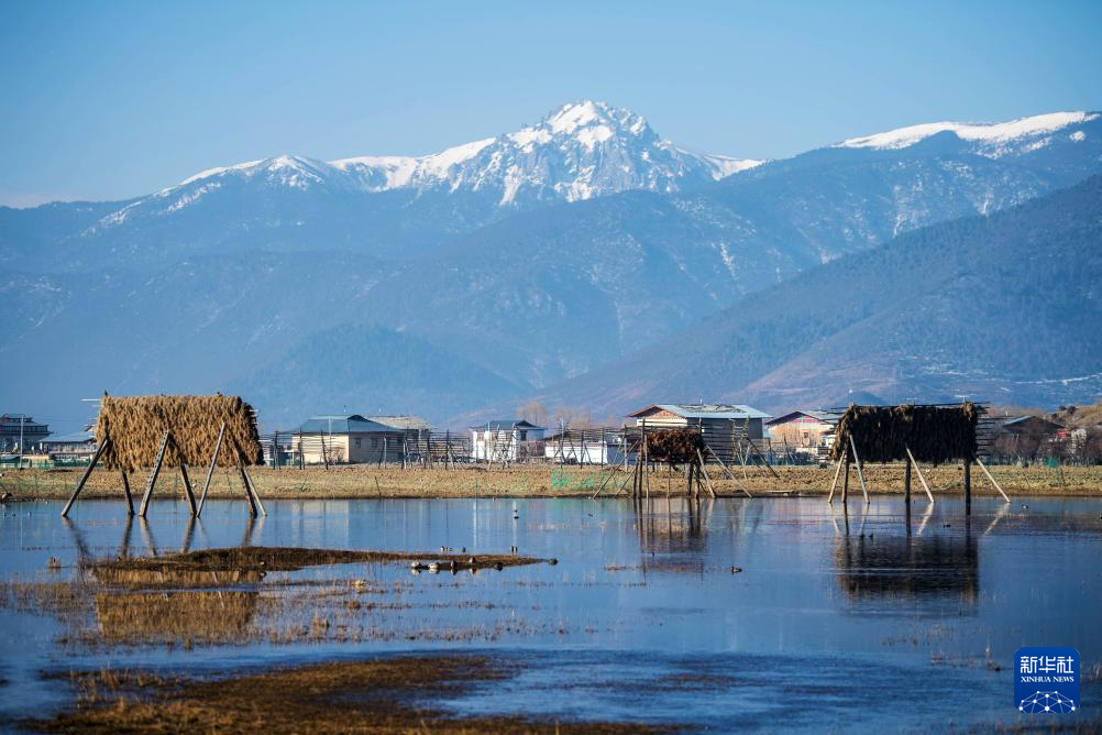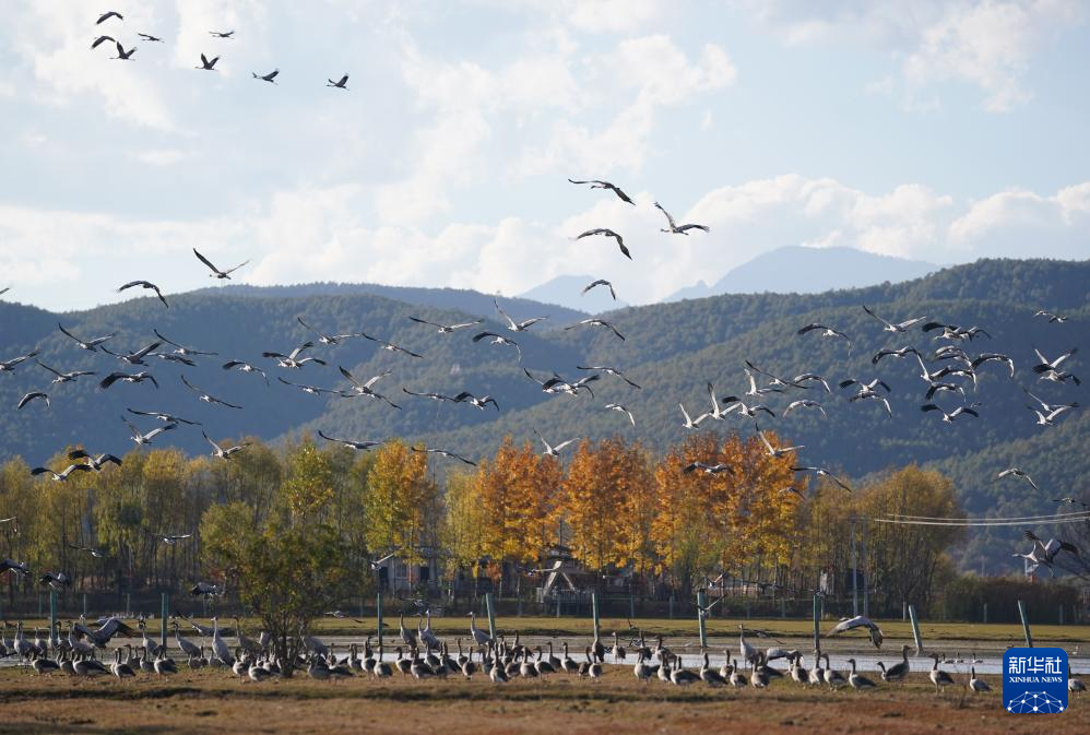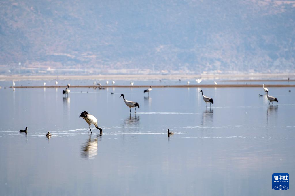 黑頸鶴和水鳥在納帕海自然保護區棲息。