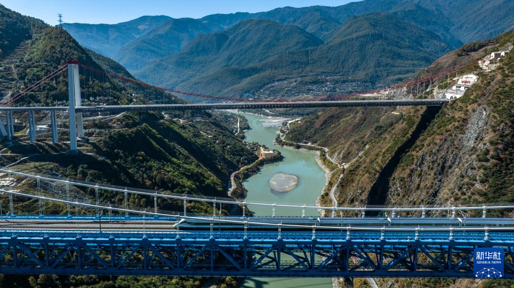 11月26日,列車駛過虎跳峽金沙江鐵路大橋。