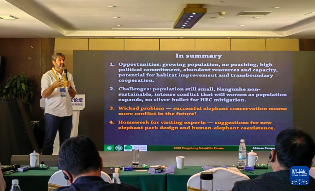 西班牙大象專家Ahimsa Campos Arceiz在做主旨報告。新華社記者 岳冉冉 攝