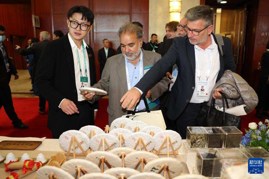 12月5日,在云南昆明參加第五屆世界媒體峰會(云南分會場)暨第二屆大象國際傳播論壇的參會代表了解云南普洱茶。新華社記者李明攝