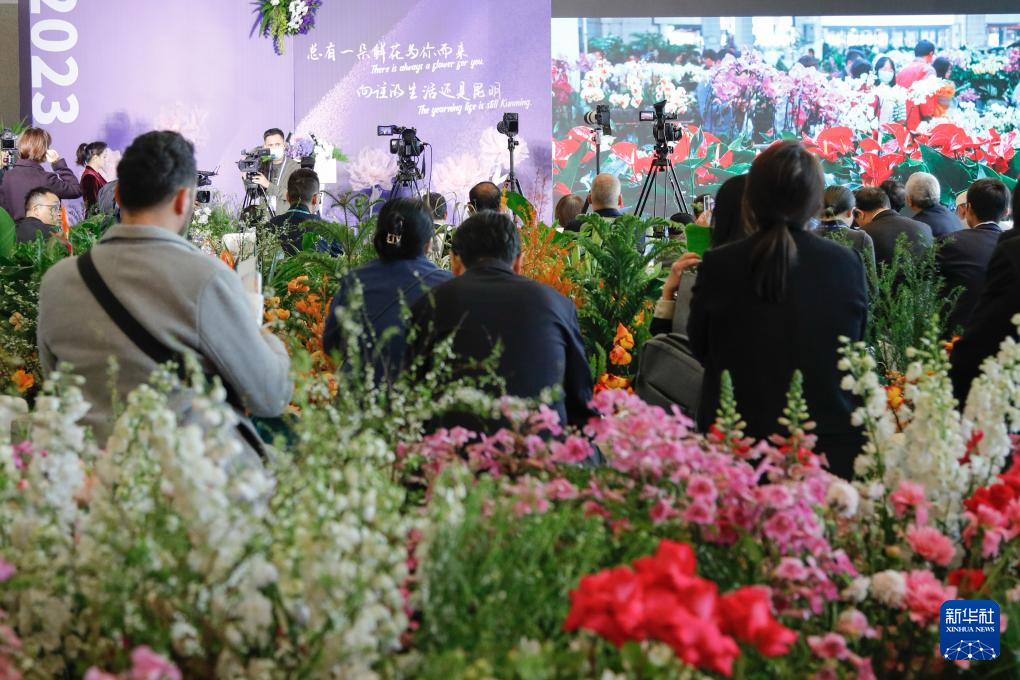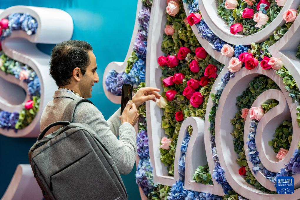 12月5日,在云南昆明參加第五屆世界媒體峰會(云南分會場)暨第二屆大象國際傳播論壇的參會代表拍攝展出的鮮花墻。新華社記者 胡超 攝