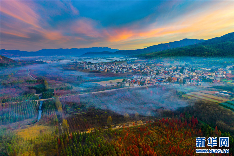 冬日暖陽下,昆明市盤龍區滇源街道甸尾村的水杉林進入觀賞期。從空中俯瞰,大自然將色彩運用得恰到好處,漫山彩林與紅霞、云霧交融,呈現出五彩斑斕的旖旎風光。(昆明市盤龍區融媒體中心)