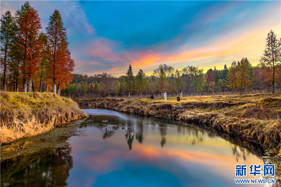 昆明市盤龍區滇源街道甸尾村,水杉與紅霞(12月5日攝)。新華網發(供圖)