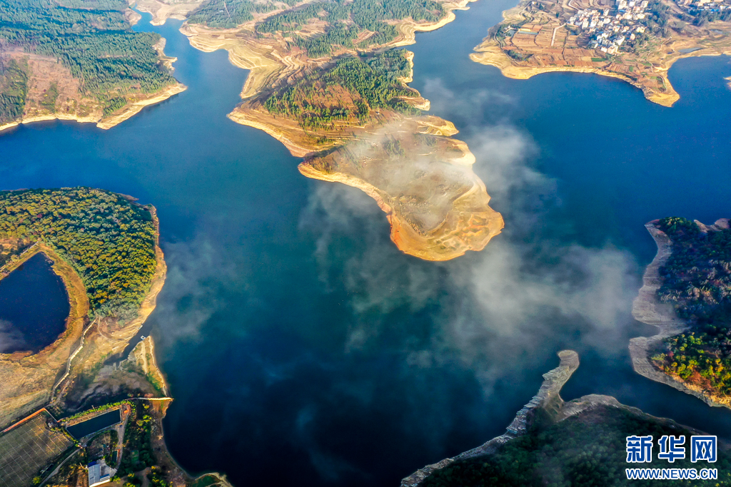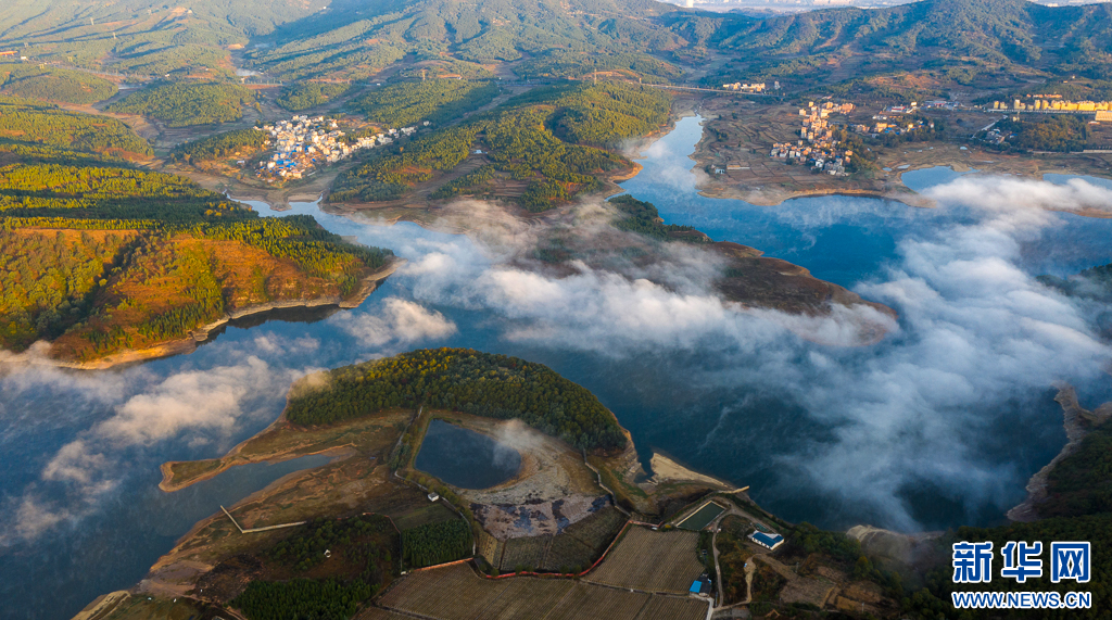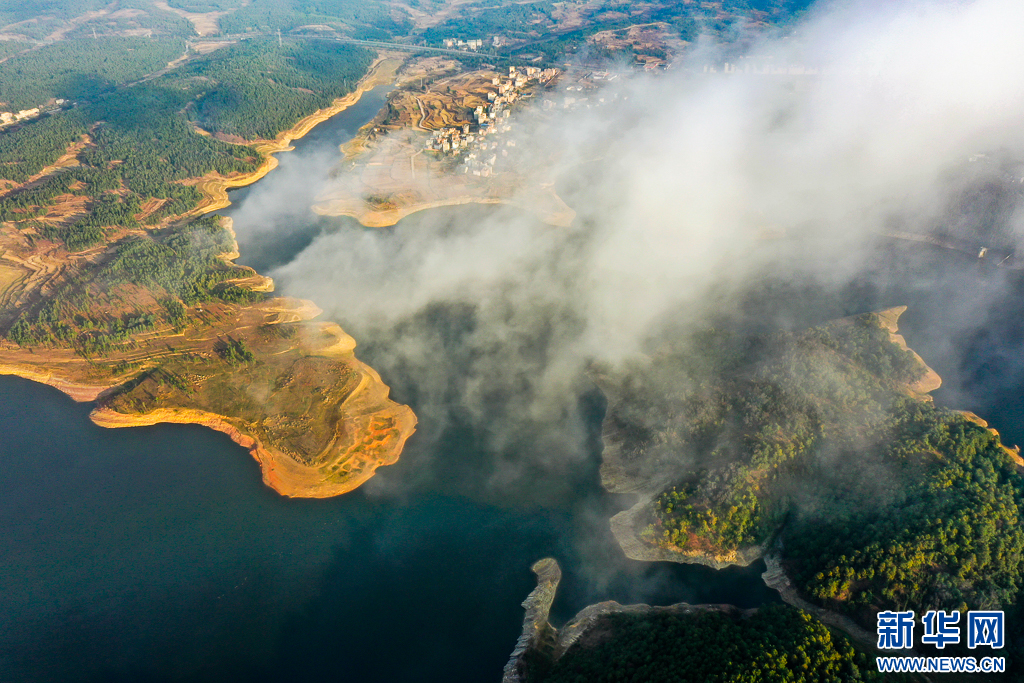 云霧繚繞的瀟湘水庫。新華網發(中共曲靖市委宣傳部供圖)
