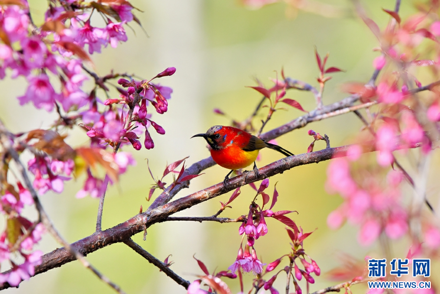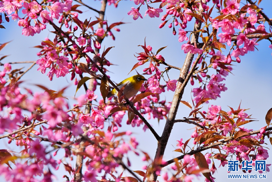 櫻花開處鳥歡樂(12月16日攝)。新華網發(吳再忠 攝)