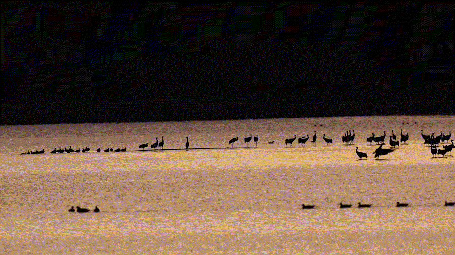 冬日里的大海子 候鳥與晨輝相映如畫卷