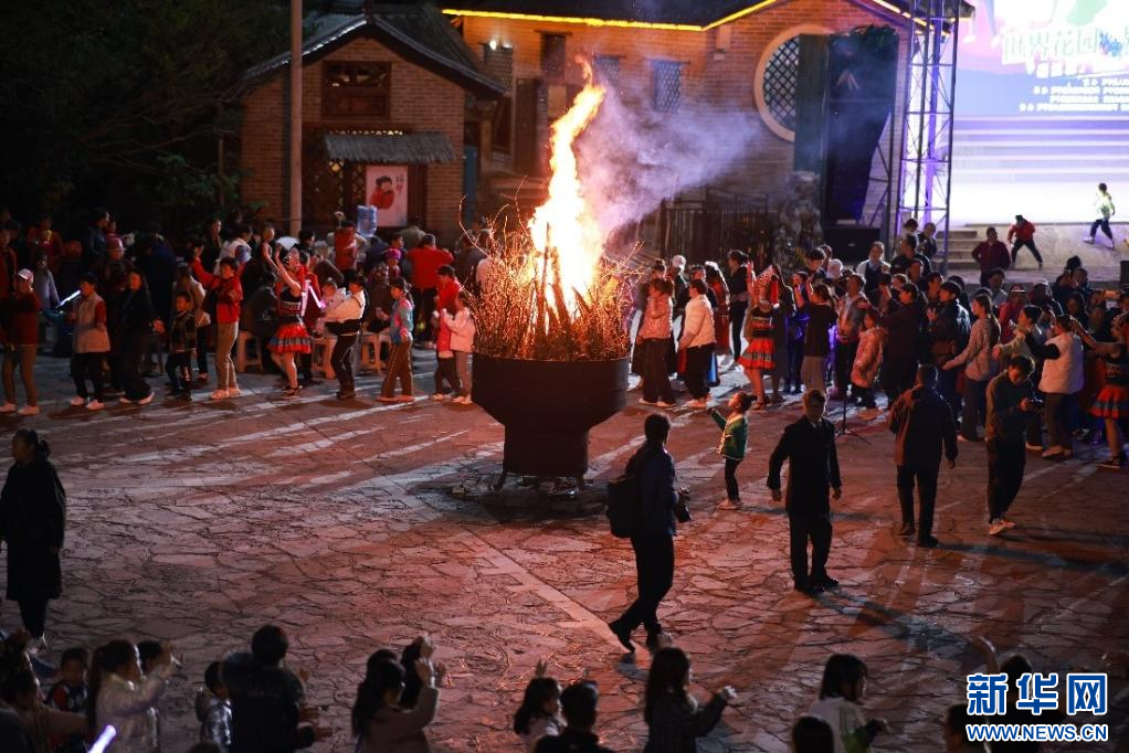 12月23日傍晚7點,在云南省曲靖市羅平縣相石階森林公園廣場舞舞臺上,一群身著民族服裝的人,彈著弦子,和著調子,彼此對視著圍成圈,跳起了布依族傳統的打跳舞。