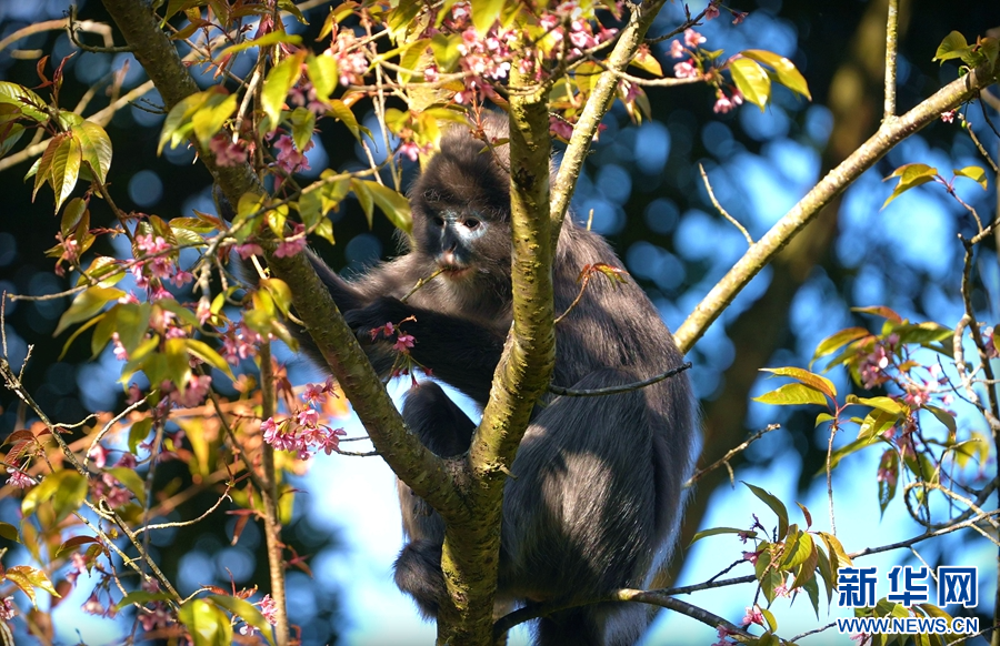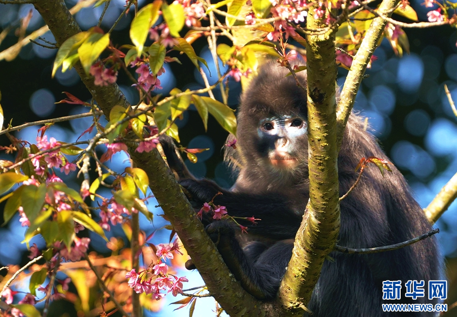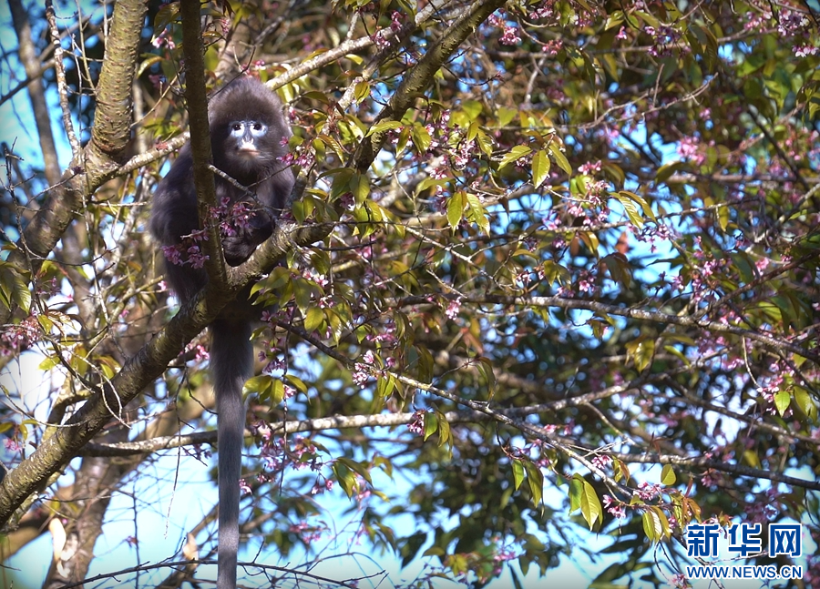 可愛的菲氏葉猴蹲在冬櫻花樹上(1月5日攝)。新華網發(隴川縣融媒體中心供圖)