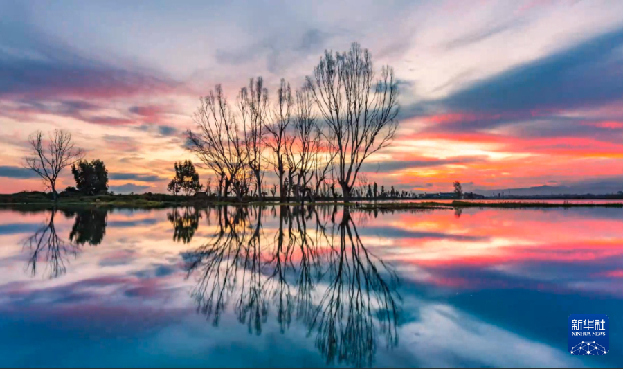 冬日,位于云南晉寧的南滇池濕地,晨曦中,云朵掩映紅日,霞光綻放,喚醒萬物。