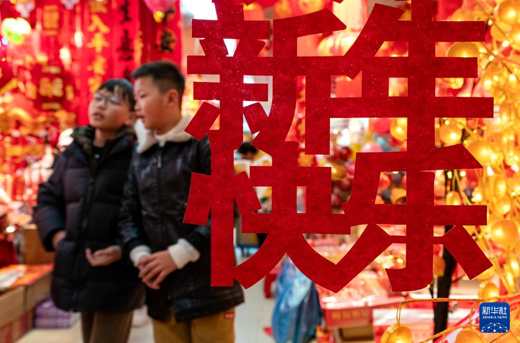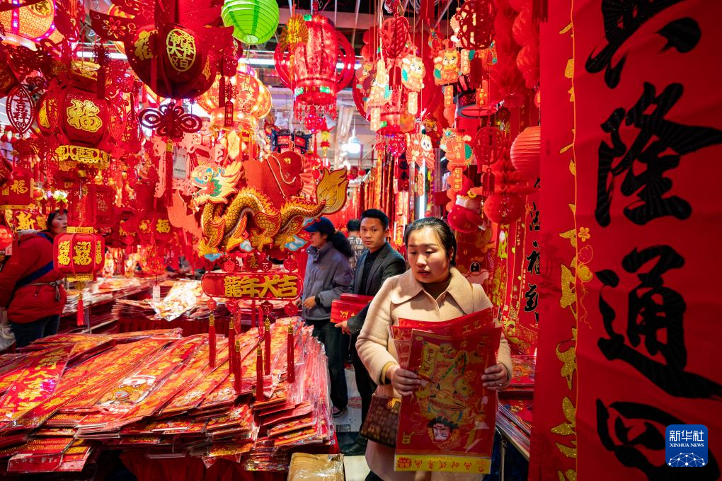 龍年春節臨近,云南昆明新螺螄灣國際商貿城內的節日飾品購銷兩旺,春聯、燈籠、龍年掛飾、中國結等受到顧客青睞。