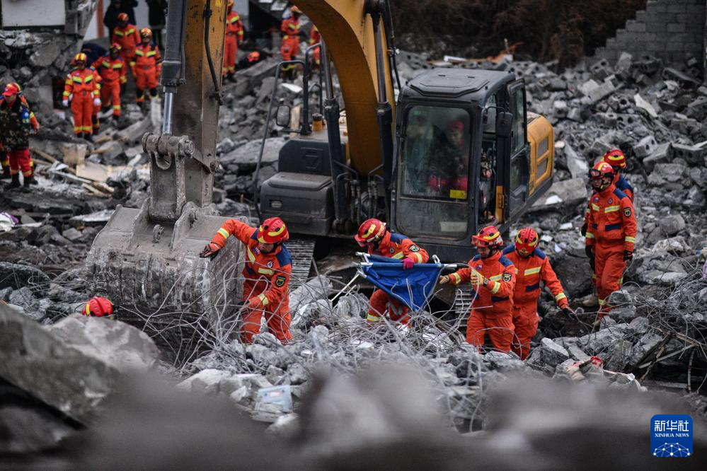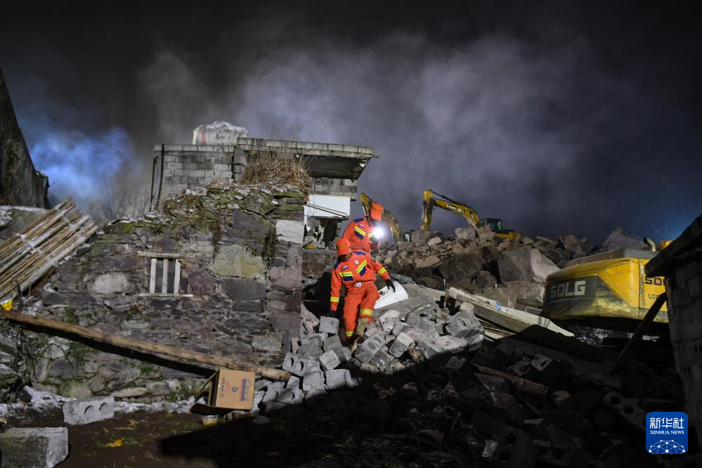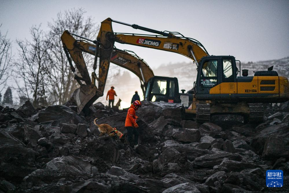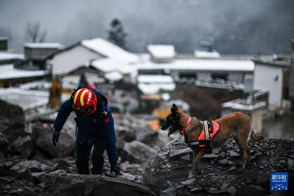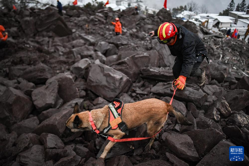 1月23日上午,救援人員攜搜救犬在現場搜救。