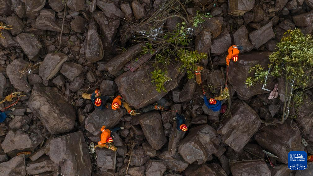1月23日上午,救援人員在現場搜救(無人機照片)。