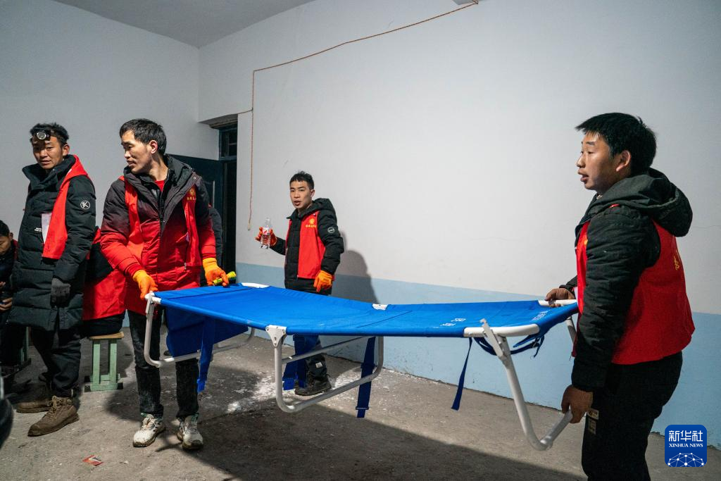 1月22日晚,志愿者在臨時安置點搬運折疊床。