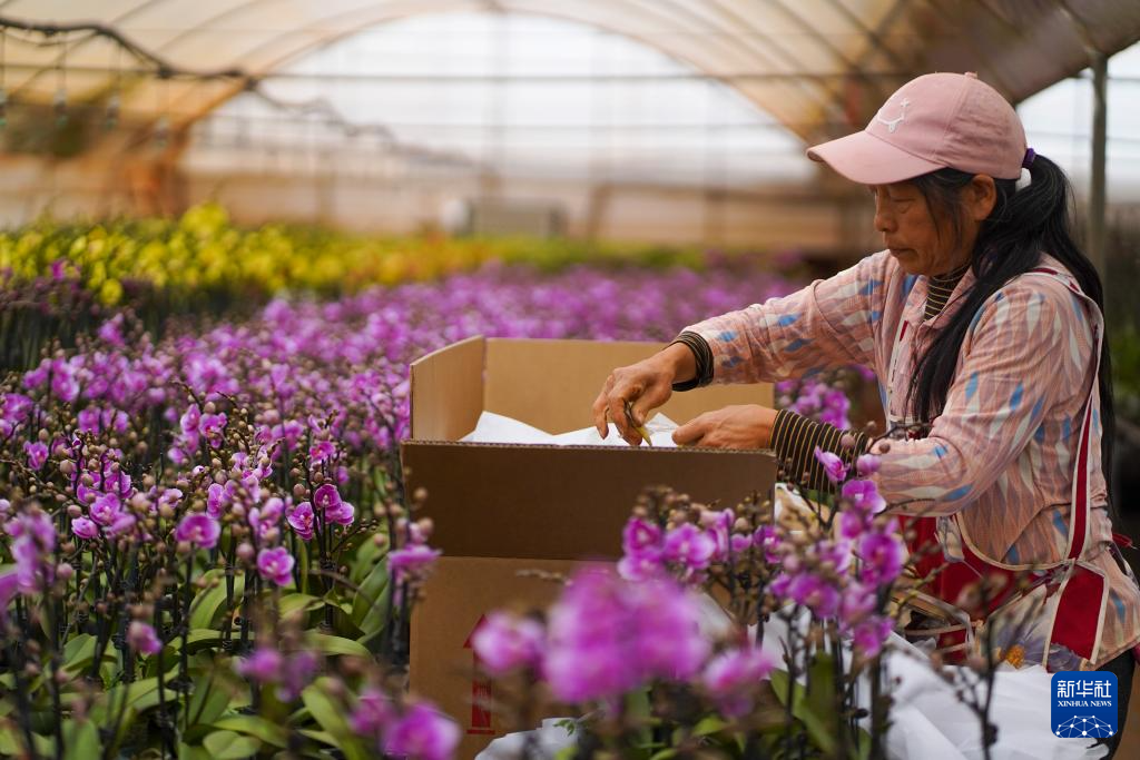 1月23日,在云南省昆明市晉寧區一家鮮花基地,花農在打包蝴蝶蘭。新華社記者 崔文 攝