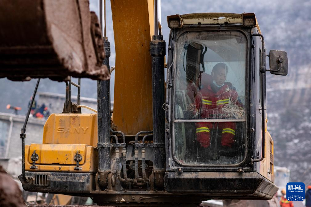 1月24日,中國安能一局唐山分公司挖掘機操作手王霄在救援現場駕駛挖掘機。