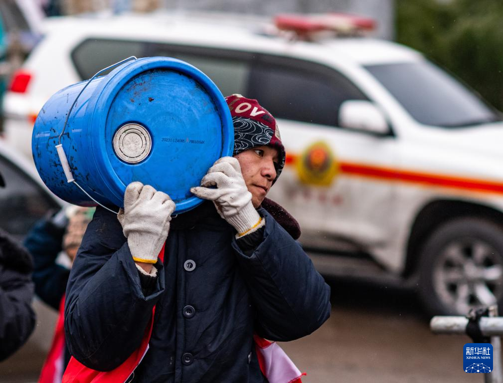 1月24日,自愿報名參加志愿服務的涼水村村民王再云往現場搬運物資。