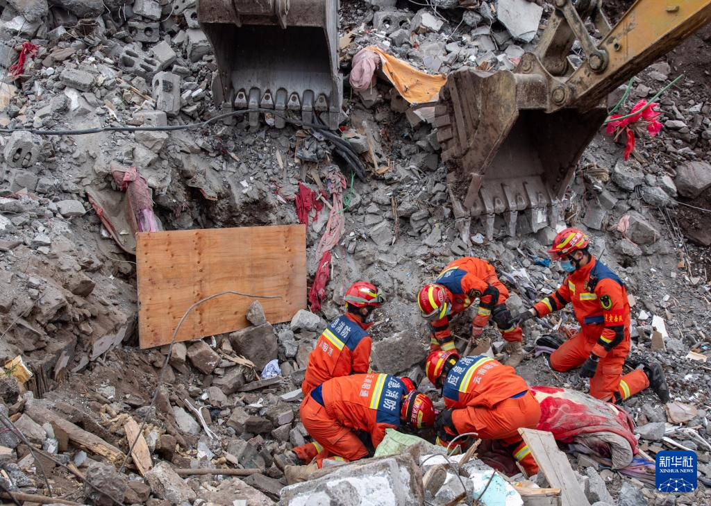 1月24日,來自昭通市消防救援支隊的余文豪(左上)和其他救援人員一起在現場救援。