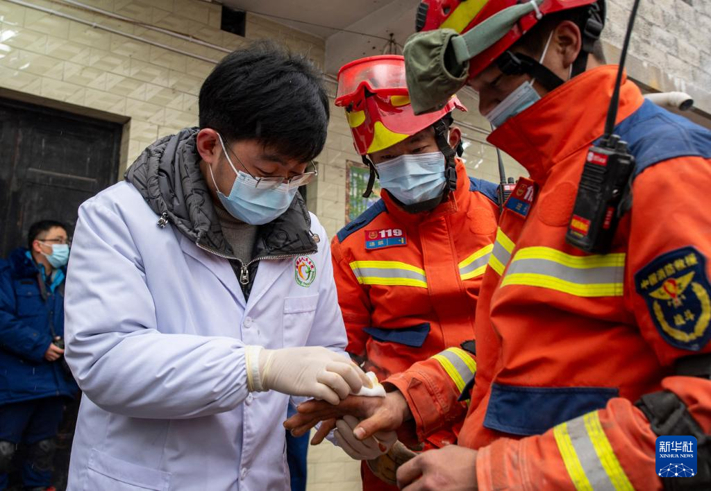1月24日,鎮雄縣人民醫院醫生付凱(左)在現場為救援人員清理傷口。