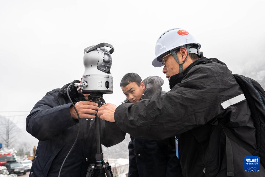 1月24日,國家隧道應急救援中鐵二局昆明隊中隊長熊丹(中)在救援現場的便攜式邊坡雷達與軌道式邊坡雷達陣地工作。