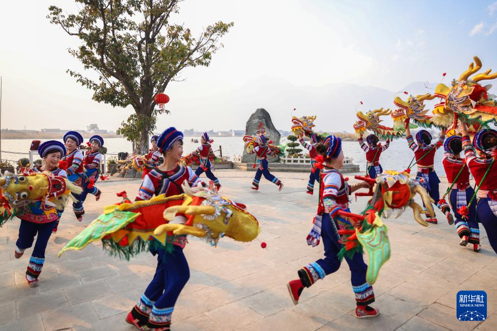 春節將至,云南洱源“非遺”走進大理西湖風景區,舞白族“板凳龍”,展演民俗文化,迎接中國農歷龍年的到來。