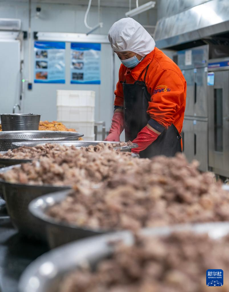1月26日,一名工作人員在中國鐵路昆明局集團有限公司冷鏈套餐生產基地內準備食材。新華社記者 陳欣波 攝