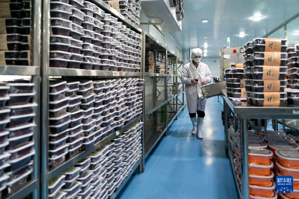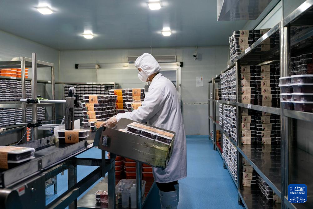 1月26日,一名工作人員在中國鐵路昆明局集團有限公司冷鏈套餐生產基地內將流水線上的冷鏈套餐取下碼放整齊。新華社記者 陳欣波 攝