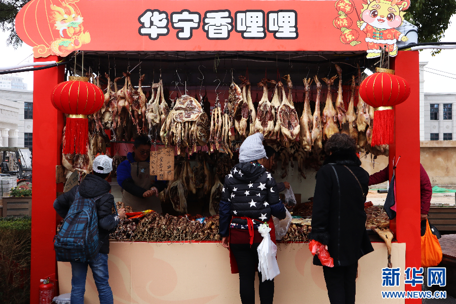 顧客購買臘肉和火腿鴨(1月24日攝)。新華網發(楊雯 攝)